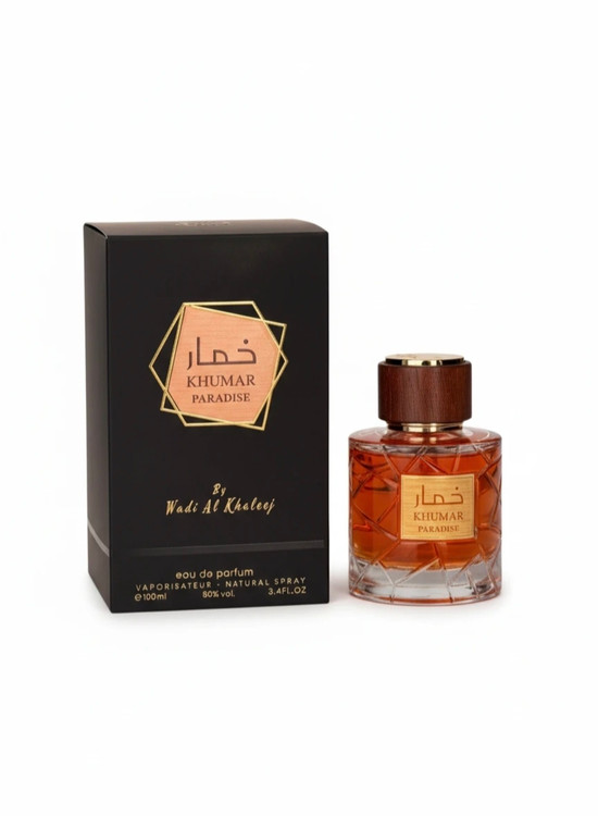 عطر ادکلن khumar paradise از برندوادی الخلیج ، عطری یونیسکس است که در سال ۲۰۲۵ به عنوان بخشی از سری خمار این برند معرفی شد. این عطر با ترنج، دارچین و تمشک آغاز میشود و به رایحههای میانی دانه تونکا ، رز و خزه درخت بلوط میرسد. این عطر در پایهای گرم از دانه تونکا ، رز ، خزه درخت بلوط قرار میگیرد و نمایی کهربایی-وانیلی با رایحه های ظریف خوراکی و مستی ارائه میدهد.