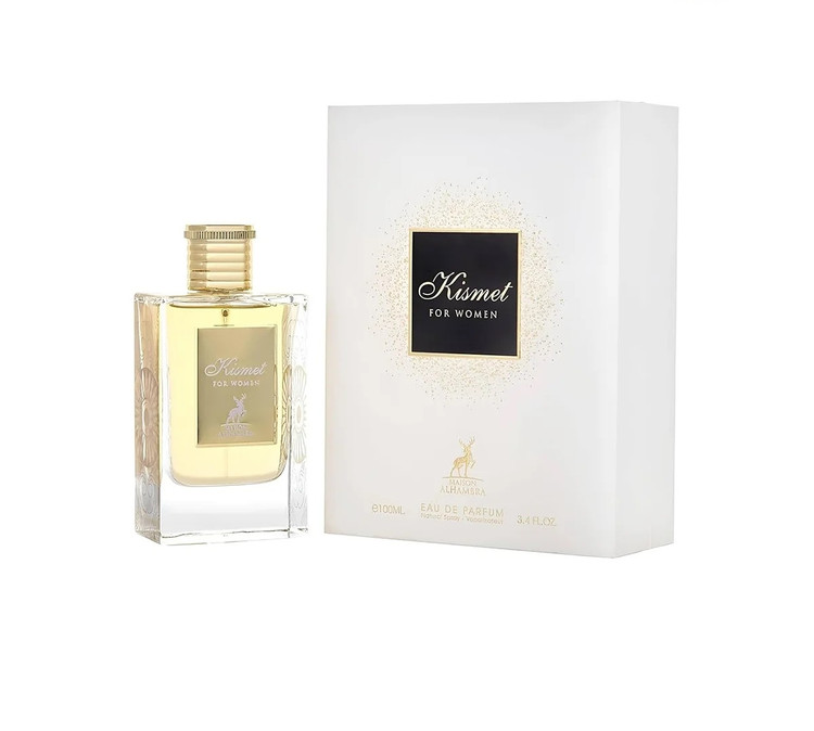 دکلن زنانه کیسمت Kismet، از برند الحمبرا Alhambra، با طراحی شیک و مینیمالیستی در یک جعبه سفید و طلایی ارائه میشود.